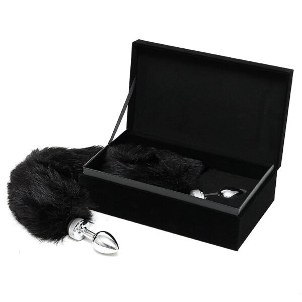 Small smooth stainless steel anal plug with a long black bushy faux tail, all in a black presentation box.